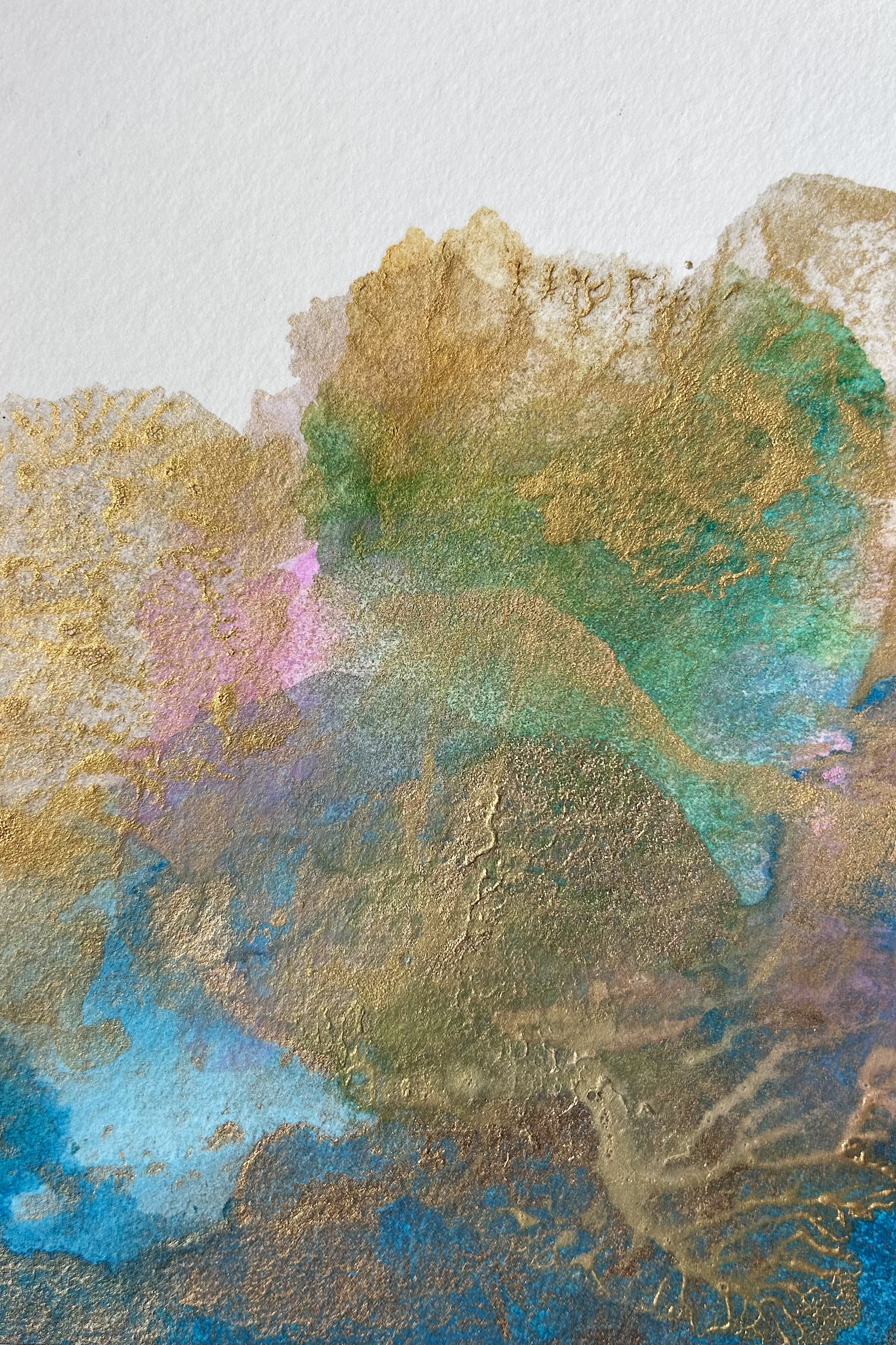 Dans Alētheia # 10, le rose de garance, pigment ancestral extrait de racines, dialogue avec la profondeur majestueuse du lapis-lazuli, cette pierre semi-précieuse broyée depuis l’Antiquité pour obtenir ce bleu intense. La Rhodonite, minéral rose tendre aux nuances subtiles, apporte sa douceur lumineuse, tandis que la malachite déploie ses verts émeraude caractéristiques. Le tout est sublimé par des touches de pigment d’or qui captent la lumière et confèrent à l’œuvre son caractère précieux et intemporel.