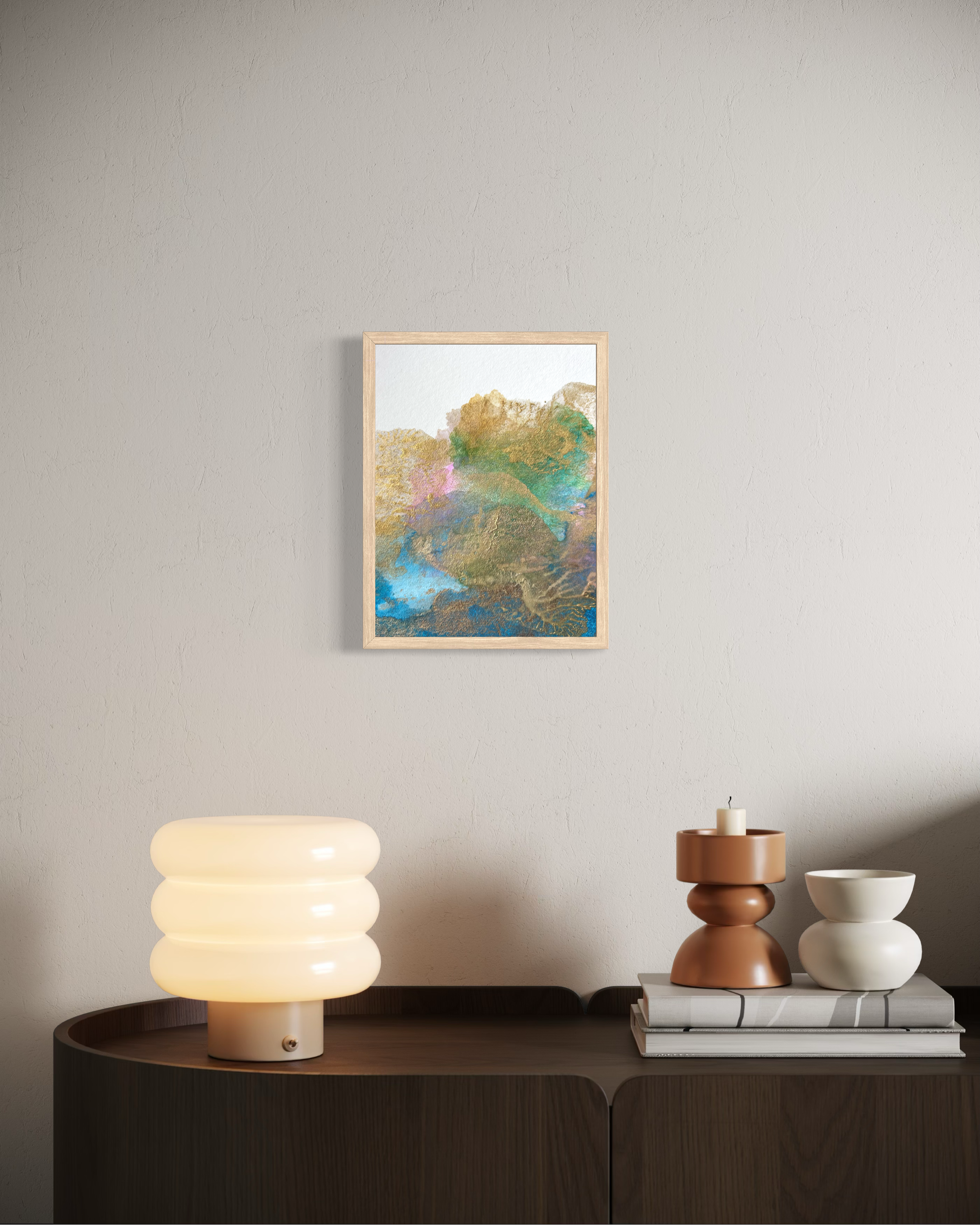 Une composition abstraite où les pigments minéraux se fondent et se superposent, créant un paysage onirique aux reflets changeants. Chaque regard révèle de nouvelles nuances, de nouveaux éclats.