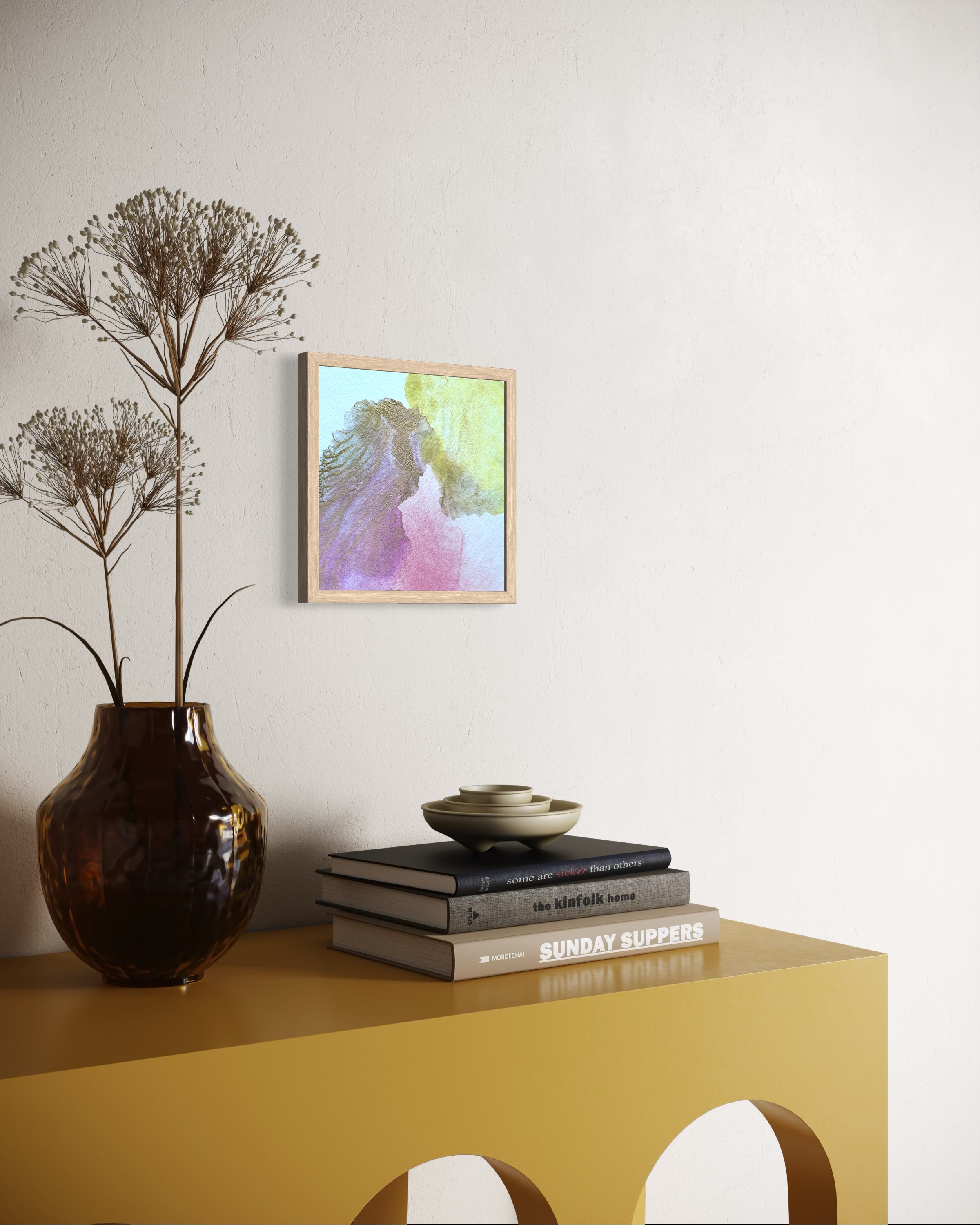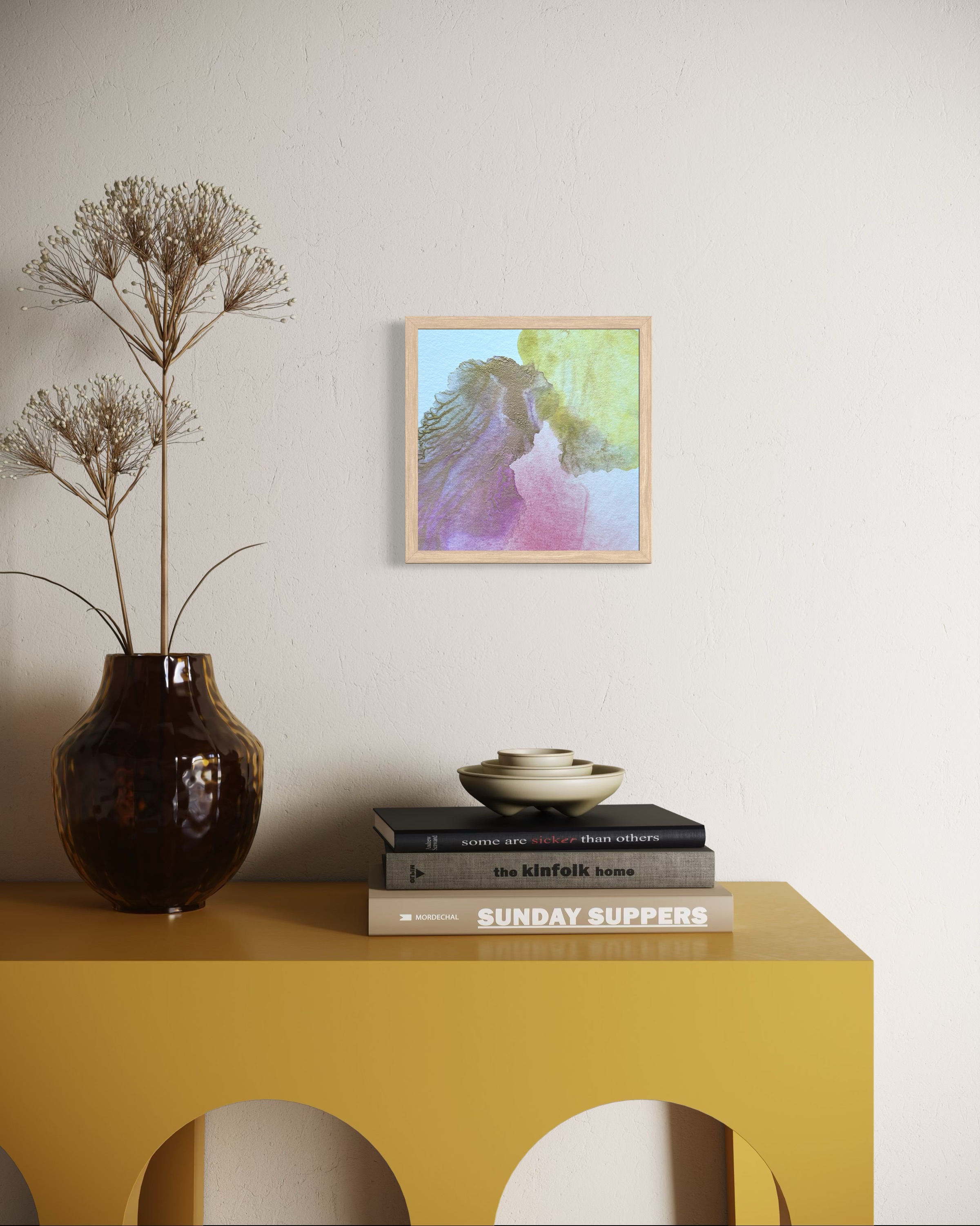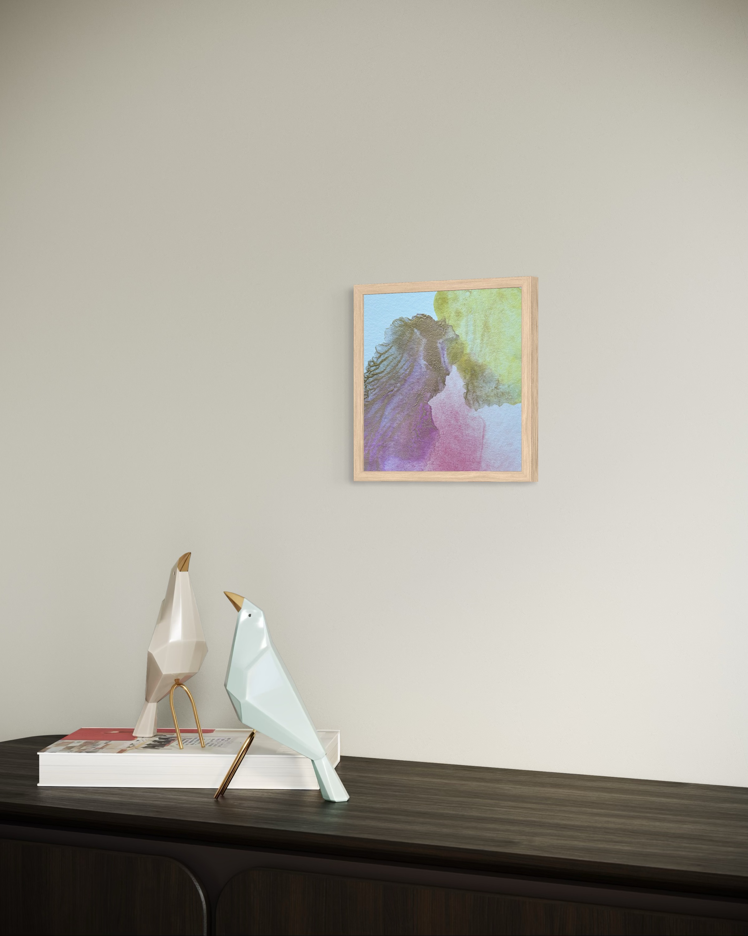 Chaque pièce est présentée dans un élégant encadrement en pin clair, un voyage intime dans les textures, les couleurs et les fragments du monde naturel. Cette série a été travaillée avec des pigments naturels d’exception : lapis-lazuli, chrysocolle, rouge de Perse, rhodonite, cobalt, malachite, rose de Garance, terres de Sienne jaune et de Naples, ainsi que de nouveaux pigments inédits qui apportent une profondeur et une luminosité uniques à chaque composition.