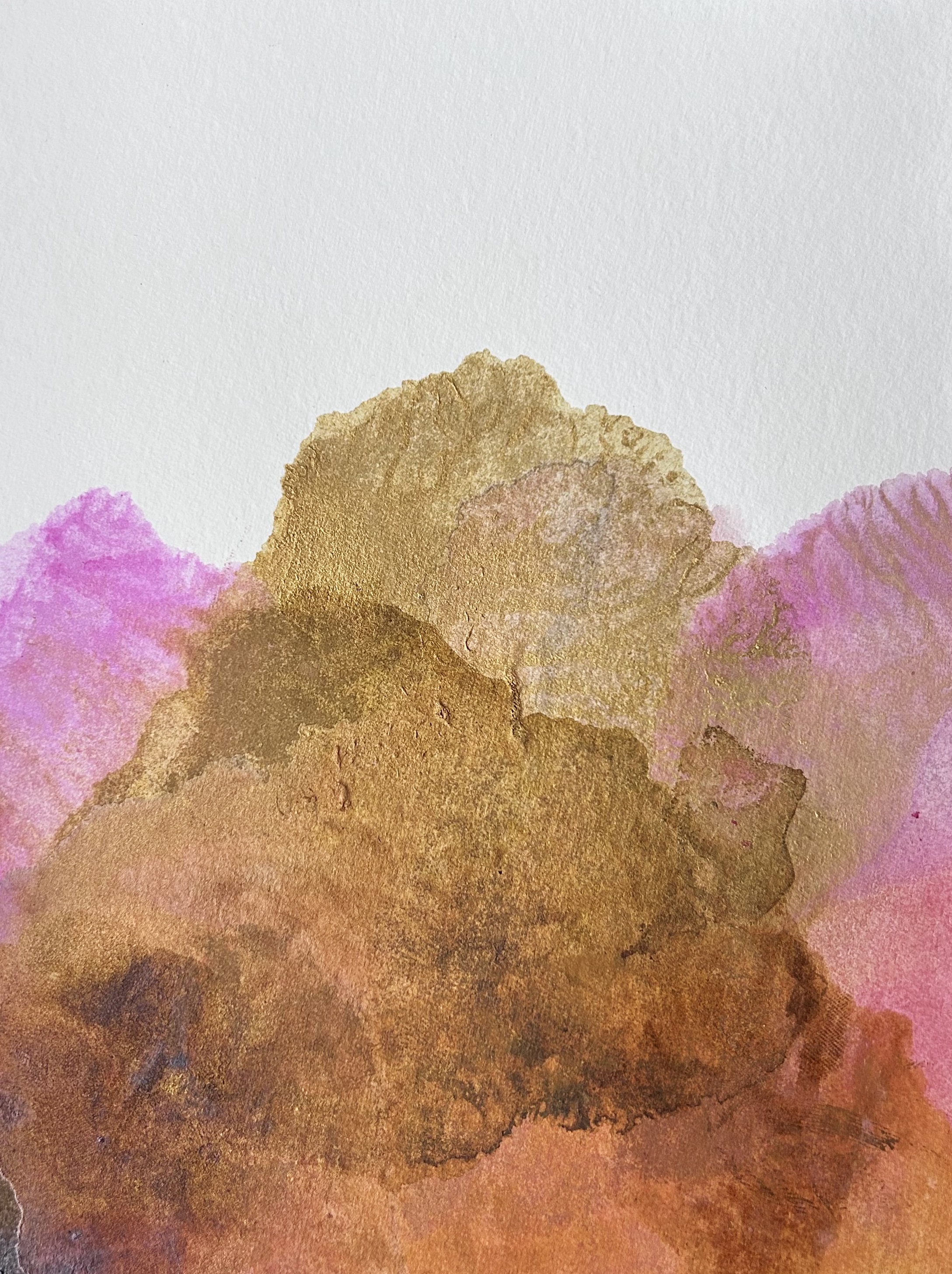 Au sommet, les dentelles d’or travaillées au pinceau fin apportent une touche romantique et précieuse, comme des broderies lumineuses qui captent la lumière. L’or et le mica forment une texture scintillante qui irradie, évoquant des veines précieuses affleurant à la surface. L’ensemble crée une atmosphère où les pigments semblent en suspension, rappelant des formations géologiques vues du ciel ou des nuages colorés transfigurés par la lumière.