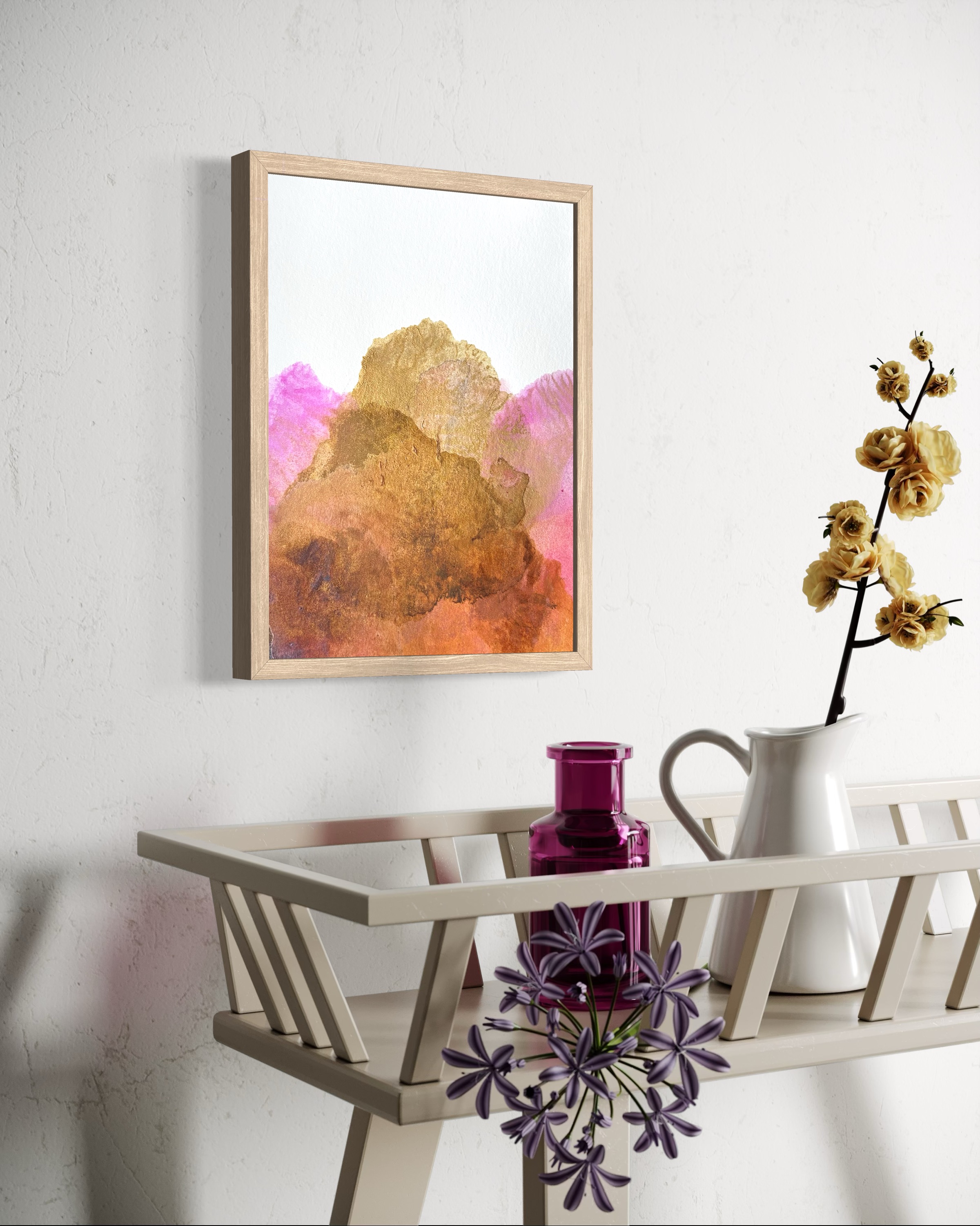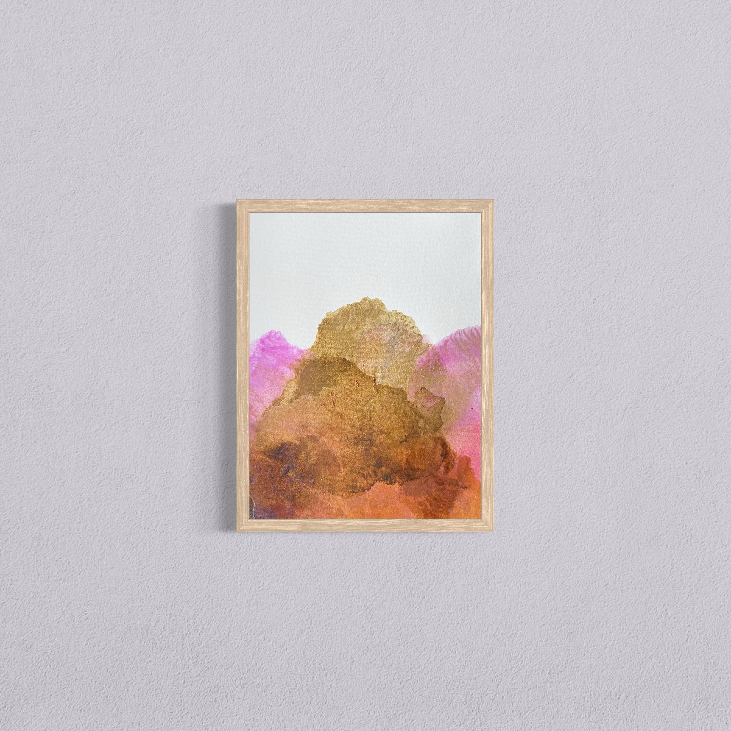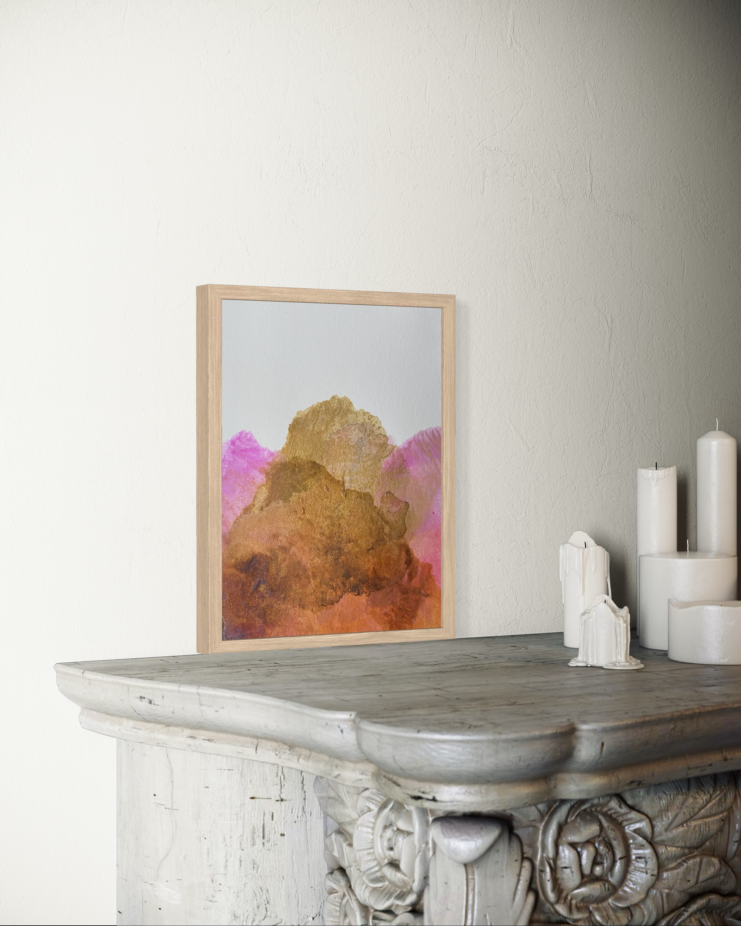 Dans Alētheia #8, les pigments naturels se déploient en une ascension lumineuse. La terre de Sienne révèle ses nuances profondes en subtiles superpositions, du cuivre aux bruns chauds, créant une profondeur organique et terreuse. Le rose de garance dialogue avec délicatesse, enveloppant la composition d’une atmosphère à la fois céleste et minérale.