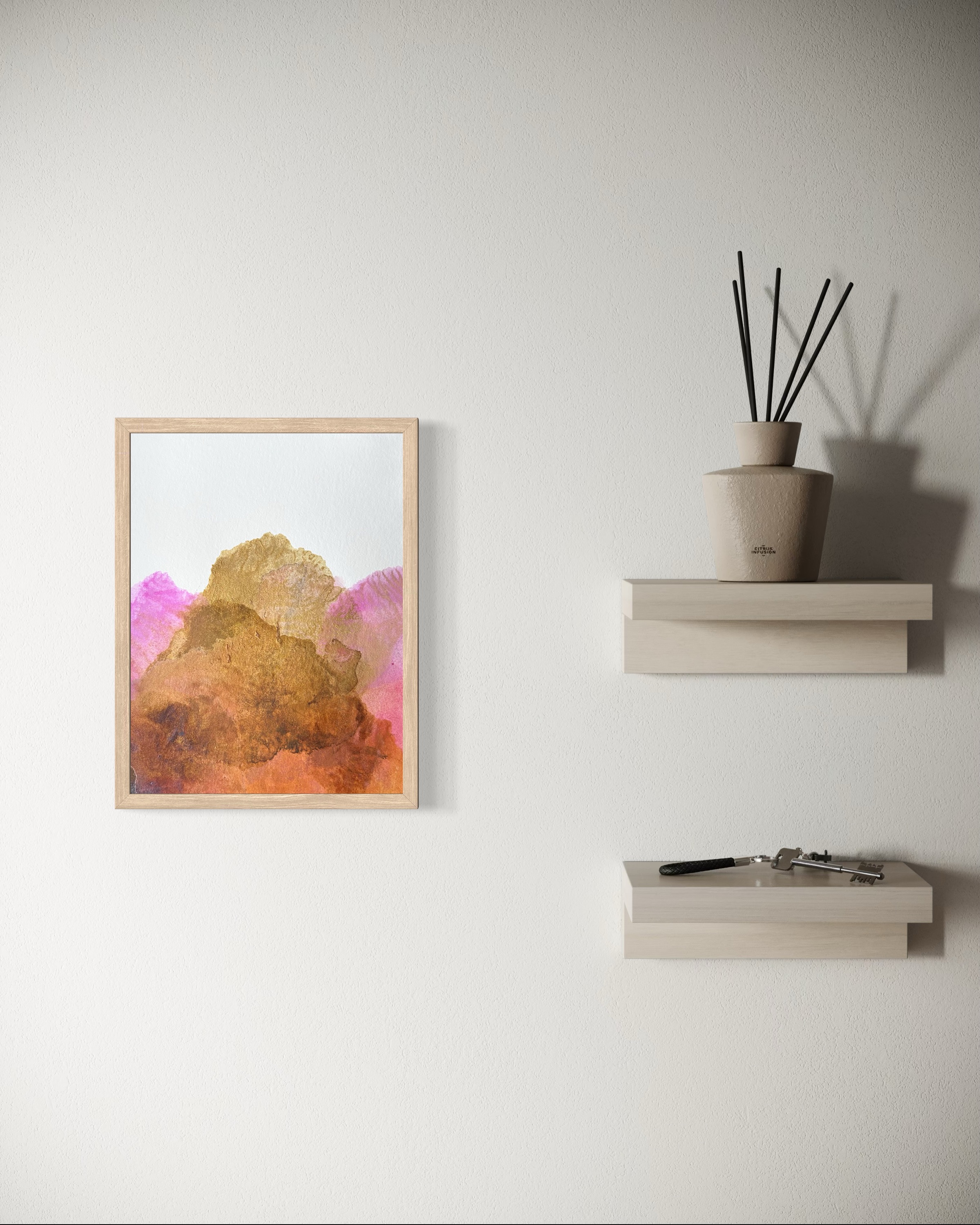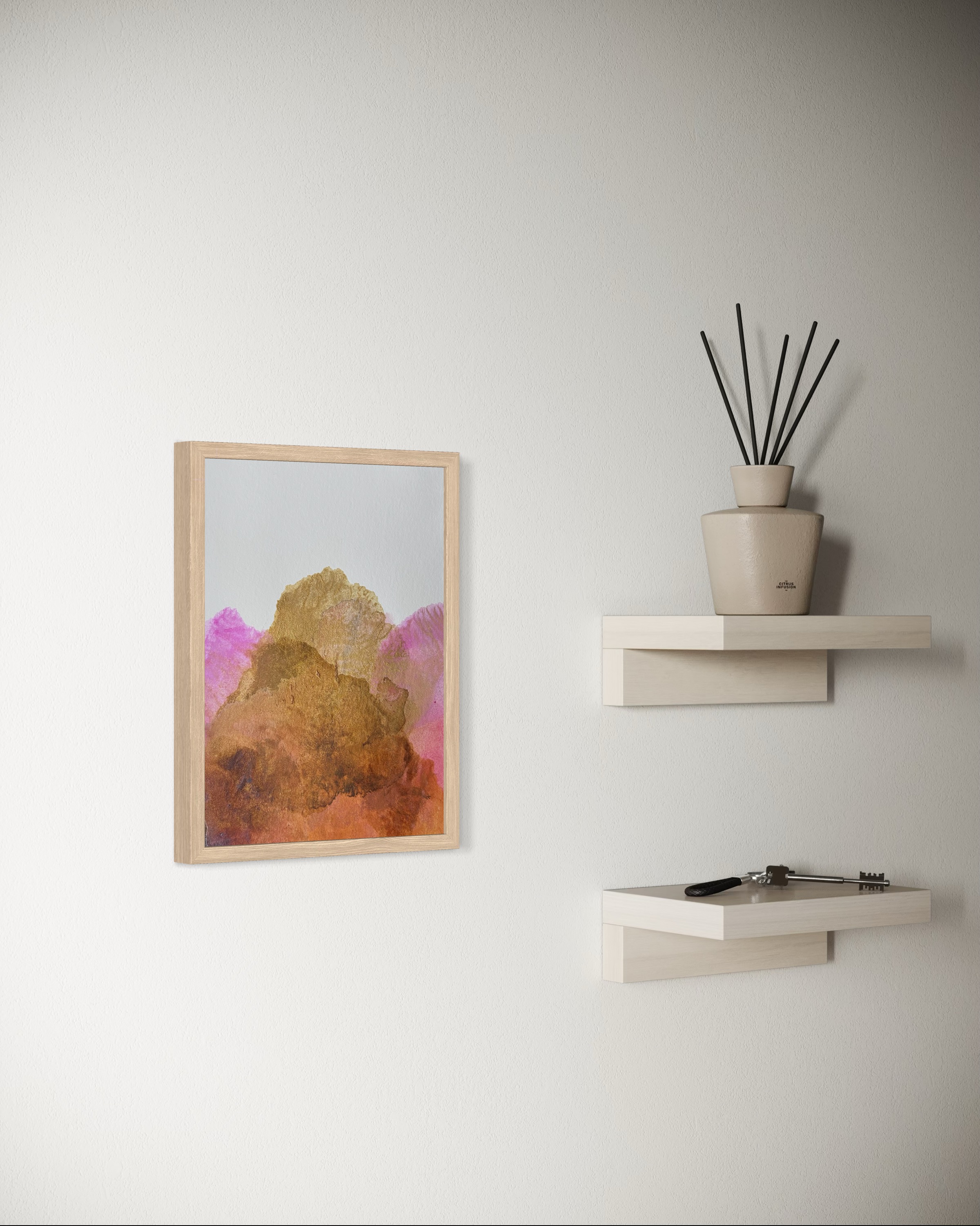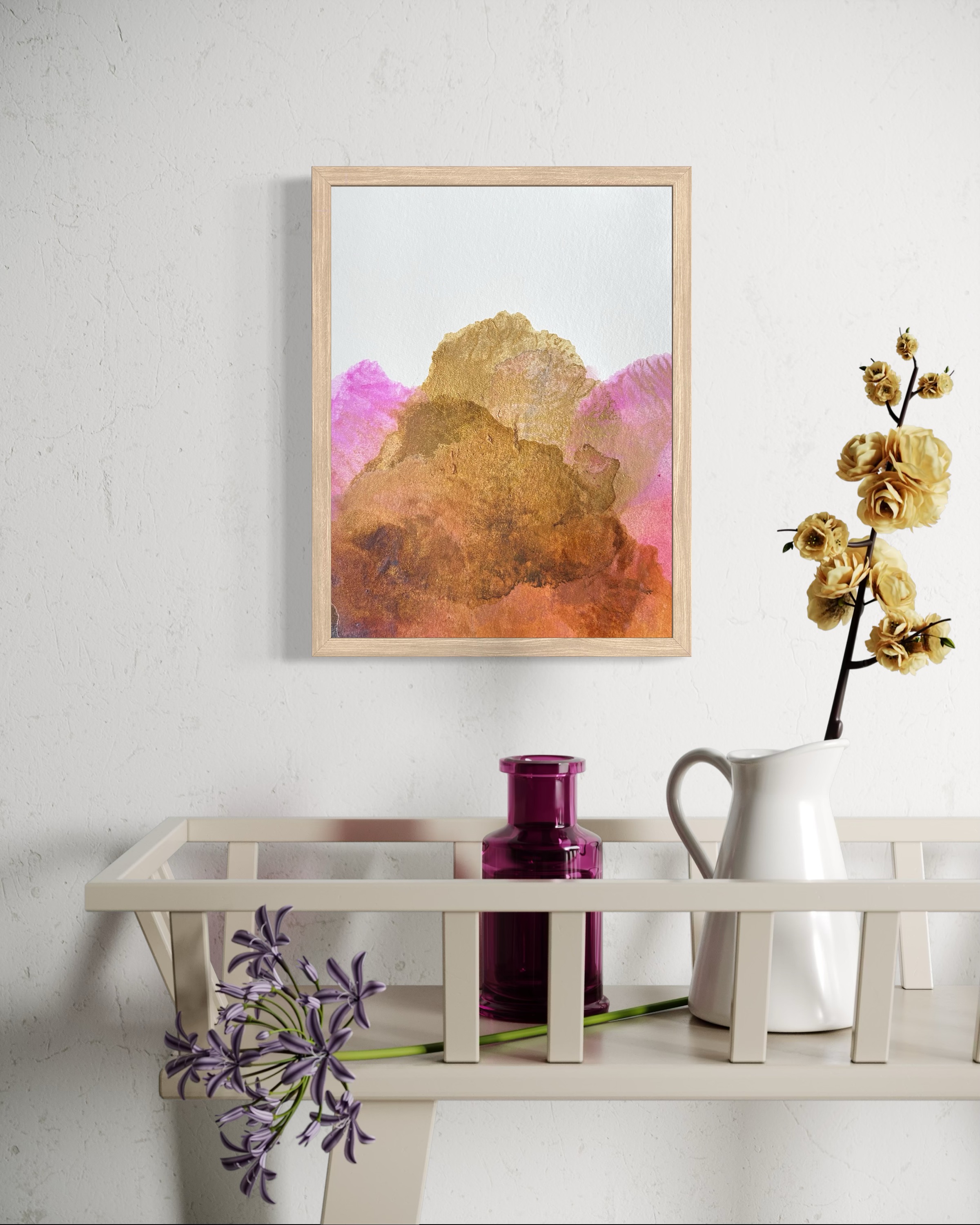 Dans Alētheia #8, les pigments naturels se déploient en une ascension lumineuse. La terre de Sienne révèle ses nuances profondes en subtiles superpositions, du cuivre aux bruns chauds, créant une profondeur organique et terreuse. Le rose de garance dialogue avec délicatesse, enveloppant la composition d’une atmosphère à la fois céleste et minérale.