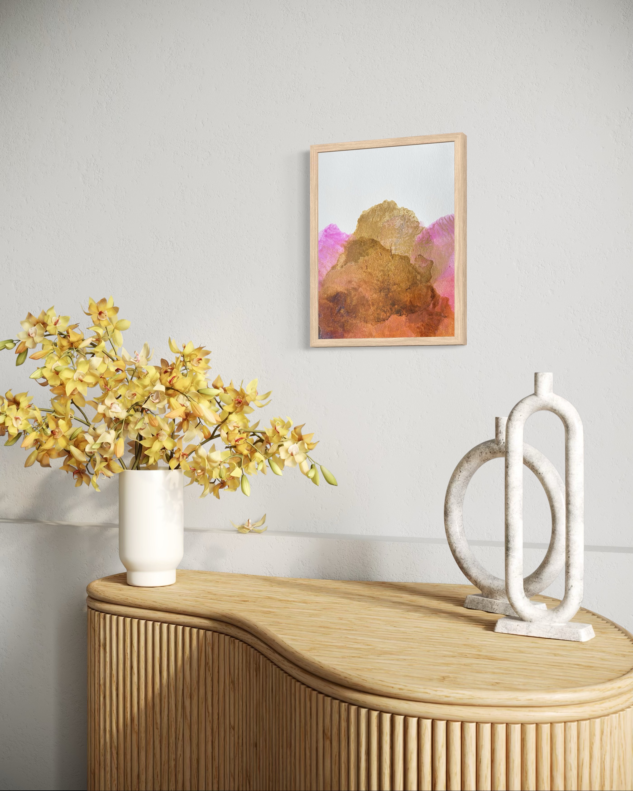 Chaque pièce est présentée dans un élégant encadrement en pin clair, un voyage intime dans les textures, les couleurs et les fragments du monde naturel. Cette série a été travaillée avec des pigments naturels d’exception : lapis-lazuli, chrysocolle, rouge de Perse, rhodonite, cobalt, malachite, rose de Garance, terres de Sienne jaune et de Naples, ainsi que de nouveaux pigments inédits qui apportent une profondeur et une luminosité uniques à chaque composition.
