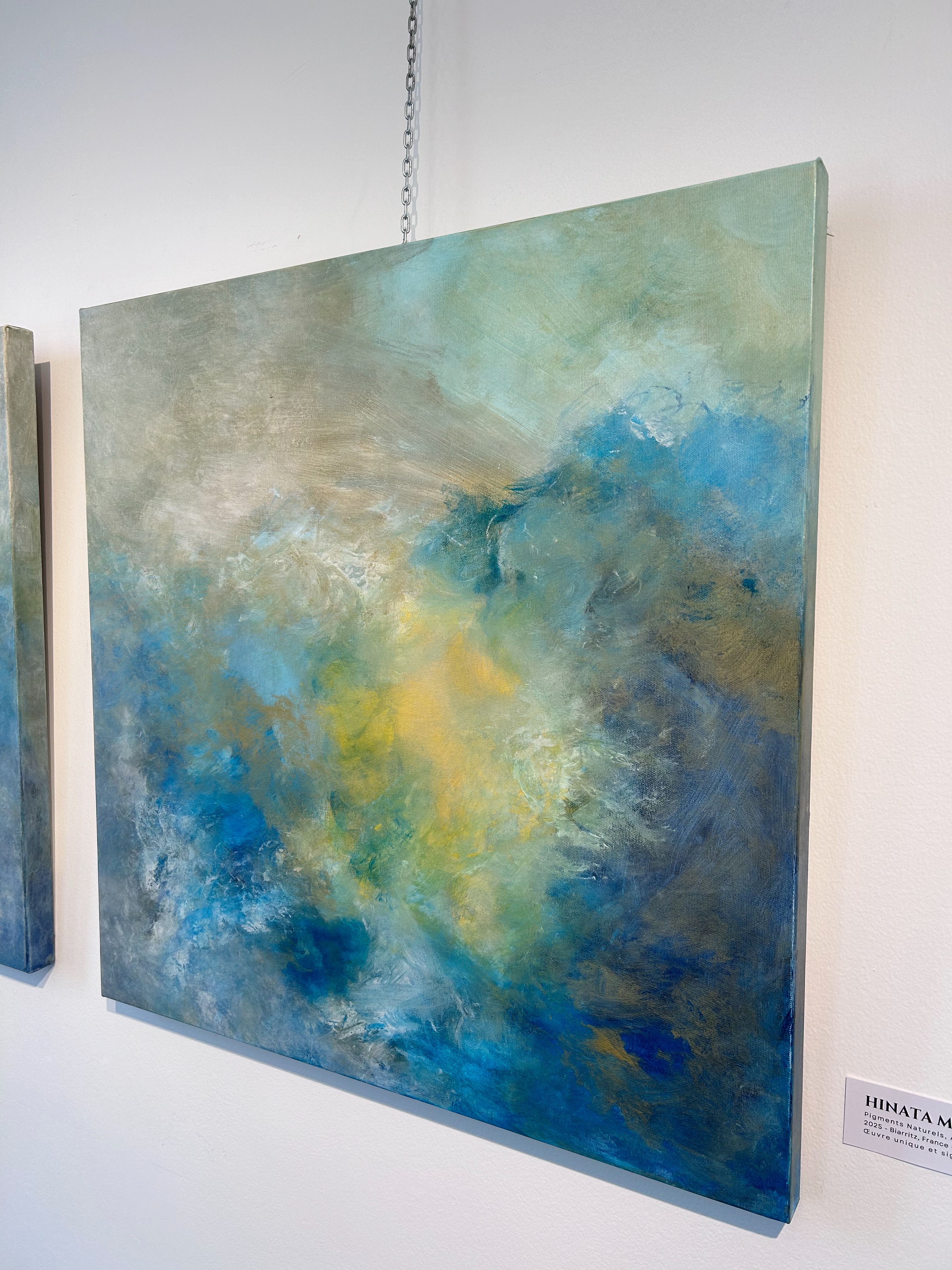 L’artiste déploie ici sa maîtrise des pigments minéraux – malachite, chrysocolle, lapis-lazuli et pyrite – pour créer une géographie intérieure. Chaque minéral révèle sa propre temporalité, sa densité particulière, participant à cette symphonie colorée où dialoguent forces telluriques et marines.